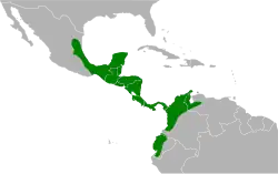 T. c. sallaei is the northernmost subspecies of gartered trogon. It is found on the Caribbean slope of central Mexico and from the Caribbean and Pacific slopes of southern Mexico through Belize, Guatemala, and El Salvador into northern Honduras and possibly into Nicaragua. T. c. concinnus is found from Costa Rica through most of Panama into western Colombia, and separately from western Ecuador into northwestern Peru. The nominate T. c. caligatus is found from the Caribbean slope of Panama's Darién Province through northern Colombia into western Venezuela. It is a year round resident in Mexico but its movements elsewhere, if any, are unknown.[2][5]