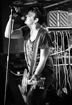 Numan lent his vocals to the track "My Machines" on the American experimental rock band Battles's second studio album Gloss Drop (2011).[100] He was chosen by Battles to perform at the ATP Nightmare Before Christmas festival that they co-curated in December 2011 in Minehead, England.[101] Numan's sixteenth solo studio album Dead Son Rising was released on 16 September 2011, which had a full UK tour split in two-halves, 15–21 September and 7–11 December.[102] Both parts were supported by Welsh solo artist Jayce Lewis; in an interview during the tour Numan said Lewis was "one of the most popular" support acts he had toured with.[103] Numan later published some of his tour diary online.[104]