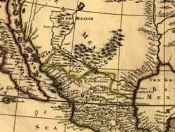 Philip Lea, North America divided into its three principal parts, 1685, detail including “Rio Escondado” flowing from the north, in “New Mexico,” southeast to the Gulf of Mexico