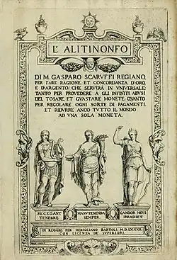 - ^ L'alitinonfo di m. Gasparo Scaruffi regiano, per fare ragione, et concordanza d'oro, e d'argento; che seruirà in vniuersale; tanto per prouedere à gli infiniti abusi del tosare, et guastare monete; quanto per regolare ogni sorte di pagamenti, et ridurre anco tutto il mondo ad una sola moneta. In Reggio: Hercoliano Bartoli. 1582. Retrieved 29 January 2018 – via Google Books.
