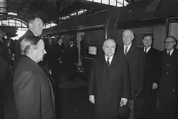 In 1945 and between 1947 and 1949 he was Minister of Finance.[6] On 11 August 1949 he became Prime Minister of Belgium in a coalition (Eyskens I) between Christian-democrats and liberals. His cabinet fell in June 1950 over the constitutional crisis caused by King Leopold III's actions during the Second World War. In the short lived government of Jean Duvieusart (June–August 1950) Eyskens was Minister of Economic Affairs.