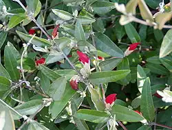 The species can grow to 1 m (3.3 ft) tall by 3 m (9.8 ft) broad. The red flowers, which have a distinctive long and curving keel, usually appear between August and November in Australia (late winter to late spring). The ovate leaves are glossy green above and silvery below.