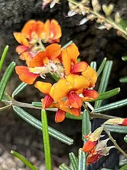 Gastrolobium stenophyllum, commonly known as narrow-leaved poison,[2] is a flowering plant in the family Fabaceae and is endemic to Western Australia. It is a bushy, upright shrub with orange, pink and red flowers. Flowering occurs from September to December or January to February. It grows at the base of outcrops, near rivers, in heath and shrubland and in sandy locations.[2]