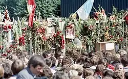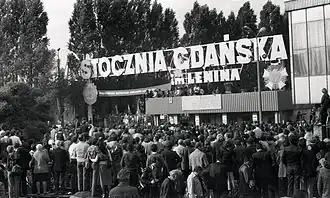 On 16 December 1970, during the Polish protests of 1970, striking shipyard workers were shot when leaving the premises of the shipyard through the gate. Two workers were killed, and 11 were injured. [3] Before the construction of the Monument to the Fallen Shipyard Workers of 1970, the Gate was the primary commemoration place for the fallen. During the August 1980 strikes, the Gate was decorated with holy pictures and a portrait of John Paul II. Over the gate, a banner reading Proletariusze wszystkich krajów, łączcie się! (Workers of the world, unite!) was placed at the time .[4] On 31 August 1980, Lech Wałęsa stood at the gate when he announced the end of the strike and the signing of the Gdańsk Agreement.[5]