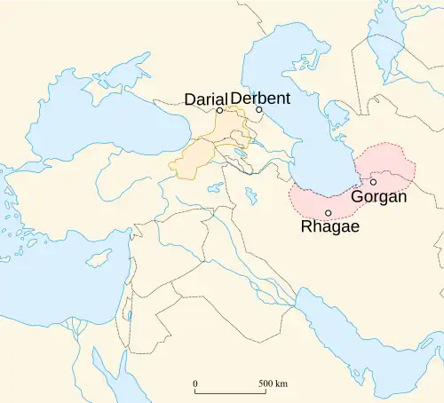 Various other passes in the Caucasus and Anatolia have been called the Gates of Alexander since at least the 1st century CE.[3] Later, the Caspian Gates were also identified with the Pass of Derbent (in modern Dagestan) on the Caspian; or with the Pass of Dariel, a gorge forming a pass between Georgia and North Ossetia–Alania. Tradition also connects it to the Great Wall of Gorgan (Red Snake) on its south-eastern shore. These fortifications were historically part of the defence lines built by the Sassanid Persians, while the Great Wall of Gorgan may have been built by the Parthians.