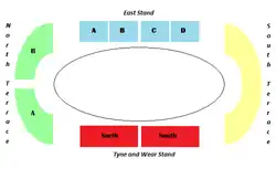 Gateshead International Stadium and its facilities occupy 24.4 hectares (60 acres) of land.[42] The main athletics arena at Gateshead International Stadium is an all-seater, bowl-shaped arena consisting of four stands of seats.[22] The precise capacity of the venue is uncertain; some sources claim it to be 11,750,[5][43] others 11,762,[25] and some provide a figure of 11,800.[44][45] The main stand is the Tyne and Wear Stand, a steep, cantilevered structure[22] seating 3,300 spectators.[46] This stand contains toilet and catering facilities and a bar area.[22] Opposite is the East Stand, a 4,000-seat structure that was uncovered until 2010, when a cantilevered canopy roof was added. A bespoke design by Fabric Architecture, the roof is a 30 metres (98 ft) structure incorporating five barrel vault forms.[47] Part of the same improvement plan added toilet and catering facilities to the East Stand.[33] The South Terrace, sometimes referred to as simply the South Stand,[48] consists of a continuous, uncovered bank of seating in eight blocks with access through four turnstiles.[41] The North Terrace is opposite and consists of two blocks of uncovered seating separated by a large scoreboard.[41]