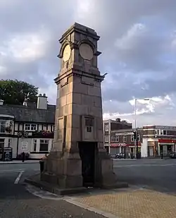 Gatley's war memorial is situated on Gatley Green, though the original First World War memorial is the clock tower at the junction of Northenden Road and Church Road. Following many years of in-operation, a clock fund was started in 2011 with the intention of repairing and restoring the clock tower and clock.[24] In mid-2012 work began on restoration, with completion in late 2012. The fully restored clock tower now boasts a fully working clock, however, its four faces are no longer illuminated at night.