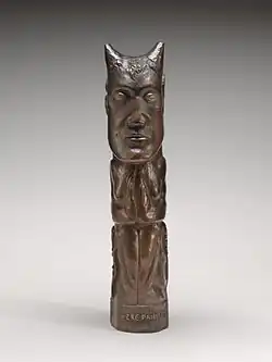Although Gauguin made some of his early strides in the world of art under Pissarro, Edgar Degas was Gauguin's most admired contemporary artist and a great influence on his work from the beginning, with his figures and interiors as well as a carved and painted medallion of singer Valérie Roumi.[66] He had a deep reverence for Degas' artistic dignity and tact.[67] It was Gauguin's healthiest, longest-lasting friendship, spanning his entire artistic career until his death.