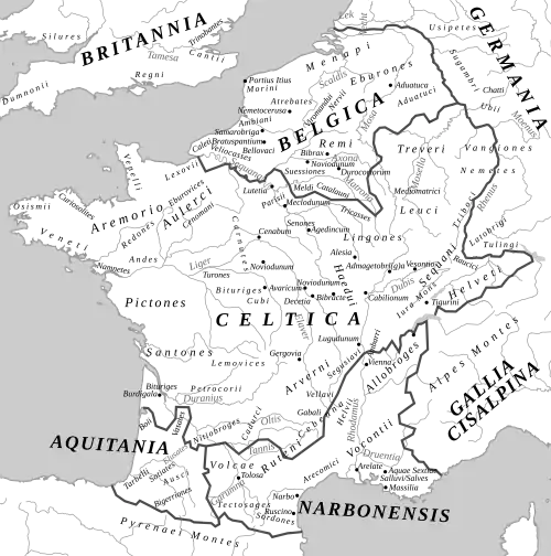 - ^ Gallia est omnis divisa in partes tres, quarum unam incolunt Belgae, aliam Aquitani, tertiam qui ipsorum lingua Celtae, nostra Galli appellantur. Julius Caesar, Commentarii de Bello Gallico, Book I, chapter 1
