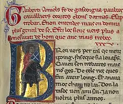 Gau(s)bert Amiel or Gausbertz Amiels was a 13th-century Gascon troubadour. His only surviving song (canso) is Breu vers per tal que meins y poing, a humorous satire of contemporary courtly poetry. This lone example of Gausbert's work is well represented in the manuscripts, however, appearing six, labelled A, D, I, K, N, and V. The poem is only ascribed to him in MS "D", where a marginal note names "Gibert Amiels" as the author. Based on the manuscripts, the poem must have been written between 1200 and 1254.