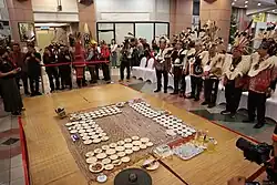 Highly decorated mats for guests to sit on are laid out on the longhouse gallery which runs the entire length of the longhouse. The act is called beranchau ("mat spreading and adjoining") which marks the opening of the Gawai.[63] The Dayaks make various types of traditional hand-woven mats.[64] There are reed mats woven with colourful designs, lampit rattan mats, bidai tree bark mats and permaidani mats.[63] The walls of most family rooms and galleries are decorated with traditional blankets such as the woven Pua Kumbu and the tied cloth (kain kebat) blankets which are made with unique Dayak designs.[65] During the festival, women are keen to display the products of their skills and hard work at mat-making and hand-weaving. Some traditional baskets are also seen. Some sets of traditional musical instruments are also displayed in the gallery.[66]