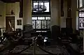 This is a very large room and is supported by four columns. Also, there are windows on all four sides of the room.