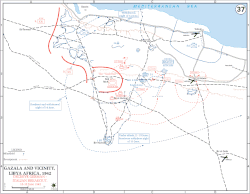 Air attacks directed by Kesselring against Malta greatly reduced its offensive capacity, allowing supply convoys from Italy to reach Axis forces in Africa with increased regularity.[17] Unternehmen Venezia (Operation Venice), the Axis plan of attack, was for armoured forces to make a flanking manoeuvre south of the fortified "box" at Bir Hakeim.[18] On the left flank, the 132nd Armoured Division "Ariete" would neutralise the Bir Hakeim box and on the right flank, the 21st Panzer Division and 15th Panzer Division would advance north behind the Eighth Army defences, to destroy the Allied armour and cut off the infantry divisions on the Gazala line. On the far right of the attack, a kampfgruppe (battle group) from the 90th Light Afrika Division was to advance to El Adem, south of Tobruk and cut the line of supply from the port to the Gazala line while holding Allied troops at Tobruk.[19]