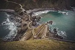 Gaztelugatxe is an islet on the coast of the Bay of Biscay belonging to the Biscayan municipality of Bermeo, in the Basque Autonomous Community. It is connected to the mainland by a man-made bridge. On top of the island stands a hermitage named Gaztelugatxeko Doniene in Basque (or San Juan de Gaztelugatxe in Spanish), dedicated to John the Baptist, that late discoveries indicate might date back to the 9th century. With another small neighboring island, Aketx, they form a protected biotope that extends from the town of Bakio to Cape Matxitxako, on the Bay of Biscay.