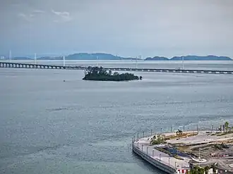 Gazumbo Island was formed in the 1980s during the construction of the bridge, which caused dredged materials to accumulate and create two islets.[1][2] The larger of these islets is known as Gazumbo Island, after a fictional island featured in a 1954 film starring P. Ramlee, although it is also referred to as Udini Island and Kazambo Island.[3][4] The smaller islet has been submerged since 2017.[1]