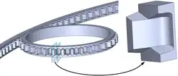 In order for the surfaces to provide efficient axial meshing, the teeth must either be beveled or made with engagement. This avoids misalignment, sticking, and reduces sliding friction in the bearing. For instance, the illustrations present implementations of bearing gears with beveled teeth and rollers on their adjacent end faces as well as a herringbone engagement to provide minimal axial shift due to opposite sloping teeth.
