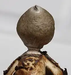 The spore sac is variable in shape, ranging from roughly spherical to egg-shaped or irregular, but it is usually taller than it is wide. Its diameter ranges between 3.5 and 16 mm (1⁄8 and 5⁄8 in), although it is most commonly between 5 and 10 mm (3⁄16 and 3⁄8 in). An apophysis (a swelling on the underside of the spore sac) is often present. The stalk is visible when the pseudoparenchymatous layer has dried up, and is short but distinct, measuring 1–2.5 mm tall. The color is variable; in dry specimens it is whitish, light beige, beige gray, smoky gray or brownish-gray. The endoperidium in newly expanded fruit bodies is pruinose: covered with a light beige to whitish powder of hyphae and crystalline matter. This powder gradually disappears as the fruit body ages. Its color is highly variable, and both light and dark endoperidia are present. The peristome (a clearly demarcated region encircling the opening of the spore sac) is distinctly delimited, with a disc-like to more or less conical shape.[18] It is lighter in color than the spore sac, and up to 2 mm high.[19] In old specimens, the hyphae around the peristome sometimes stick together to develop radial grooves. The color is variable, but often of grayish or grayish-brown tints, often lighter than the endoperidium. The columella (sterile tissue, usually originating in the base of the gleba, extending into or through the gleba) is rather weak, more or less columnar to club-shaped, emerging from a more or less bulge-like continuation of the stalk and intruding to about the half or more into the mature gleba. The mature gleba is dark brown.[18] G. quadrifidum is inedible.[16]