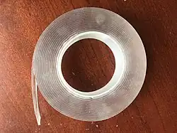 Nano tape, also called gecko tape (or commercially as Insanity Tape or Alien Tape) is a synthetic adhesive tape consisting of arrays of carbon nanotubes transferred onto a backing material of flexible polymer tape. These arrays are called synthetic setae and mimic the nanostructures found on the toes of a gecko; this is an example of biomimicry. The adhesion is achieved not with chemical adhesives, but via van der Waals forces, which are weak electric forces generated between two atoms or molecules that are very close to each other.[1][2]