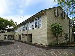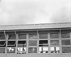 With the school population still rising, by April 1958 Block E had been extended by three classrooms 24 by 21 feet (7.3 m × 6.4 m) to its west, at a cost of £7127.[30][31][32] Block E was extended again, by two classrooms to the west, in the financial year to 30 June 1959, with the end classroom supported on timber trusses.[33][34] Block D was also extended, by one DPW-designed classroom to its west, in 1960, which unlike the earlier Boulton & Paul sections had crimped metal-clad bag rack balustrades to the upper verandah.[35][36][37] A new classroom was created beneath this western one, to a plan approved in July 1961.[38][1]