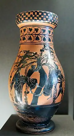 The Gela Painter was an Attic black-figure vase painter. His real name is unknown. His long career started around the turn of the 6th and 5th centuries BC. A majority of his works, consisting mainly of lekythoi were exported to West Greece. His work was strongly influenced by the newly developed red-figure style. His style is often careless, but his images are original. Especially his mythological and genre scenes are notable. Often, his compositions on smaller vases mirror those normally used on larger, more expensive, ones. On his shoulder ornaments, he replaced the conventional buds with leaves.