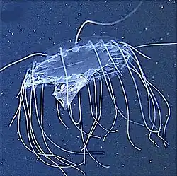 Pelagic siphonophores, a diverse group of modular cnidarians, are found at most depths of the ocean - from the surface, like the Portuguese man of war, to the deep sea. They play important roles in ocean ecosystems, and are among the most abundant gelatinous predators.[10]