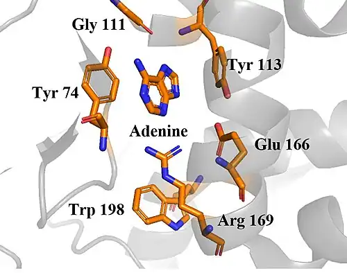 Gelonin’s active site is a cleft formed by six key residues: Tyr74, Gly111, Tyr113, Glu166, Arg169, and Trp198. The shape of the active site is stabilized by hydrogen bonding between Gly111 and Tyr113. Tyr113, Glu166, and Arg169 residues in the activate site participate in the enzymatic removal of adenine at the 4324 site of eukaryotic 28S rRNA.[3] Although the reaction mechanism of gelonin has yet to be characterized in detail, it is believed to take place in a manner that is conserved among other type 1 ribosome-inactivating proteins(RIP).[4] According to research performed on other Type 1 RIPs, Tyr113 and Arg169 form hydrogen bonds with nitrogen atoms in the adenine nucleobase. This facilitates the cleavage of the glycoside bond connecting the nucleobase and ribose, creating a transition state with a positively charged oxocarbenium ion intermediate. The oxocarbenium ion is stabilized by the negative charge of Glu166. Gelonin’s active site also contains three water molecules, which act as nucleophiles and attack the oxocarbenium ion, completing the reaction.[5]