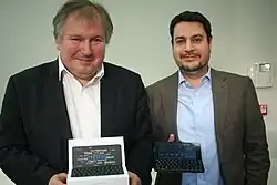 The Gemini PDA is a personal digital assistant[1] designed by Planet Computers[2] in association with Martin Riddiford, who formerly worked on the Psion Series 5 in the 1990s,[3] and crowdfunded via Indiegogo in 2017.[4] The Gemini bucks the trend of modern smartphones in its screen being primarily used in landscape aspect, and having a keyboard, i.e. taking on the form of a subnotebook.