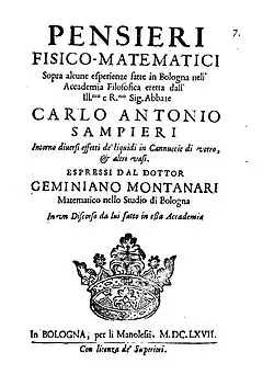 - Pensieri fisico-matematici intorno diversi effetti de' liquidi in cannuccie di vetro e altri vasi. In Bologna: Emilio Maria & fratelli Manolessi. 1667. Retrieved 15 June 2015.