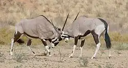 | Gemsboks mock fighting at Leeudril, Nossob River, Kgalagadi Transfrontier Park, Northern Cape, South Africa | |