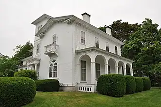 The General George Stark House is located north of downtown Nashua, on the west side of Concord Street, just north of a triangular grassy area formed by its junction with Manchester Street. It is a 2+1⁄2-story wood-frame structure, covered by a low-pitch gabled and hipped roof with elongated eaves supported by brackets. It has an irregular plan, with a three-story square tower rising over its entrance, which is set in an arched opening. The main block is finished in flushboarding, while an ell extending west behind the tower is clapboarded. A single-story hip-roofed porch extends across its street-facing eastern facade, with arched openings and a dentillated and bracketed cornice.[3]