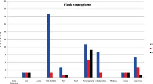 Female gravesites of all ages at Osteria dell'Osa unanimously contain items that were likely considered feminine within Latial society, many of which are seemingly personal accoutrements. Fibulae are among the most common feminine ornaments for all age groups in Osteria, although children's fibulae are typically smaller than fibulae uncovered in adult burials.[18] Arch fibulae, specifically, are associated with female burials across multiple Latial sites, such as Tivoli, Ardea, and Osteria.[19] However, in Rome, arch fibulae appear almost evenly distributed across male and female burials, perhaps indicating that the item was not associated with any particular gender.[19] Moreover, arch fibulae samples occur alongside both textile tools, a typically feminine burial good, and helmets or razors, which were usually masculine funerary items. Cecilie Brøns, a classical archaeologist, doubts whether fibulae-type was directly related to gender in Latial culture, citing the cooccurrence of arch fibulae with both male and female burial objects.[17]