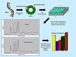 In the GeneCalling protocol, mRNAs are first isolated from a given sample and processed into fragments for analysis. This usually involves the synthesis and subdivision of double-stranded cDNAs from polyA RNA. Distinct sets of restriction enzymes can then be used to digest sets of the divided cDNAs and resulting fragments ligated to labelled adapters to be amplified by PCR. PCR products are then purified and subjected to gel electrophoresis on a mounted platform employing stationary laser excitation and a multi-colour charge-coupled device imaging system.[5] A fluorescent label at the 5' end of one of the PCR primers allows for visualization of the PCR fragments, and the cDNAs are subjected to several isolated and identical restriction digests to generate a merged profile based on peak height and variance.[6] The merged digestion profiles from the cDNA preparations are then compared to locate differentially expressed fragments (such as between normal tissue and diseased or drug responsive tissue); these profiles are compared by means of various internet-ready databases such as GeneScape.[7]