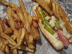 Gene & Jude's is a popular and iconic hot dog stand in River Grove, Illinois,[1] founded in 1946 by Chicago city worker Gene Mormino.[2] The stand is famous for its limited approach to the Chicago-style hot dog, its toppings departing from tradition by including only mustard, onions, relish, sport peppers and fresh cut French fries placed on top, known as a Depression Dog.[3] The menu is limited to hot dogs, double dogs, tamales and fries, and notably lacks ketchup.[2]