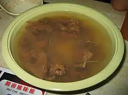 Gēng (Chinese: 羹; pinyin: gēng; Wade–Giles: keng1; Pe̍h-ōe-jī: keⁿ / kiⁿ) is type of thick or clear soup found in Chinese cuisine. Its thickening agent is usually starch which makes the soup translucent and smooth. Many soups can be cooked in this way, such as expensive shark fin soup, Madame Song's fish soup (宋嫂魚羹), and corn soup.