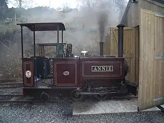 The tramway operated two W. G. Bagnall locomotives. "Jack", was works No. 1879 of 1911. It was originally 0-4-0ST, but was later modified with a trailing axle and tender to be a 0-4-2.[4] "Jack" was delivered from the Bagnall Locomotive Works, England, on 26 January 1911. It had a weight of 5.25 tons and measured 11 ft 4 in (3.45 m) over the buffers. "Jack's" weight increased to 7 tons, when the tender was added by the council.[2] "Annie", works No. 1922 also of 1911, was built a 0-4-2T side tank.[4] "Annie" arrived from the Bagnall Works on the S.S."Squall" on 23 March 1912, and was stationed at the quarry end of the tramway.[2] A replica locomotive operates at the Groudle Glen Railway on the Isle of Man, and another was built beforehand in Australia. Both locos worked at Moutohora Quarry until being laid up circa 1924. The whereabouts of "Jack" are unknown, but the frames of "Annie" have been preserved at the East Coast Museum of Technology, Makaraka.[4] The tramway also used a Straker steam road waggon converted to rail use.[5]