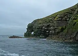 The Geo of Ork is a narrow and deep cleft in the cliff face of the northernmost point on the island of Shapinsay in the Orkney islands. The term geo or gya derives from Old Norse gjá.[1] This landform was created by the wave driven erosion of cliffs along faults or bedding planes in the rock.[2] A well-preserved prehistoric broch lies slightly to the south of Geo of Ork on the eastern coast of Shapinsay. This drystone broch has extant remains of ancient stone furniture inside.[3]
