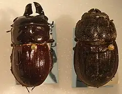 This beetle ranges in length (including mandibles) from 18.0 to 28.5 mm (males) and from 19.4 to 24 mm (females). It has a glossy exoskeleton which ranges in colour from reddish-black to black. Like Geodorcus servandus, its elytra are not distinctly ribbed. This is a feature that distinguishes G. sororum from G. capito which is also found in the Chatham Islands. They demonstrate sexual dimorphism with an overall size difference and obvious differences in mandible shape and size.[2] The two species of Geodorcus beetle on the Chatham Islands share a common ancestor. Mitochondrial DNA analysis shows that G. capito and G. sororum are more closely related than either is to the other Geodorcus species found on mainland New Zealand. Individuals of G. sororum are very closely related to each other and have low genetic diversity.[4]