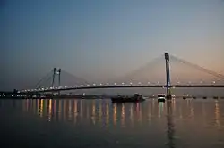 Spread roughly north–south along the east bank of the Hooghly River, Kolkata sits within the lower Ganges Delta of eastern India; the city's elevation is 1.5–9 m (5–30 ft).[6] The city is fringed by extensive mangrove ecosystems and tidal flats.[7]