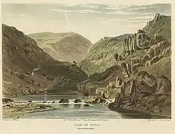 Wales has many waterfalls, including some of the most striking in the United Kingdom. One such is the 240 ft (73 m) Pistyll Rhaeadr near the village of Llanrhaeadr-ym-Mochnant. It is formed as a mountain stream drops over a cliff and changes character to a lowland river, the Afon Rhaeadr. The site was designated by the Countryside Council for Wales as the 1000th Site of Special Scientific Interest in Wales, because of its importance to an understanding of Welsh geomorphology. The 19th-century English author George Borrow remarked of the waterfall, "I never saw water falling so gracefully, so much like thin, beautiful threads, as here."[63]