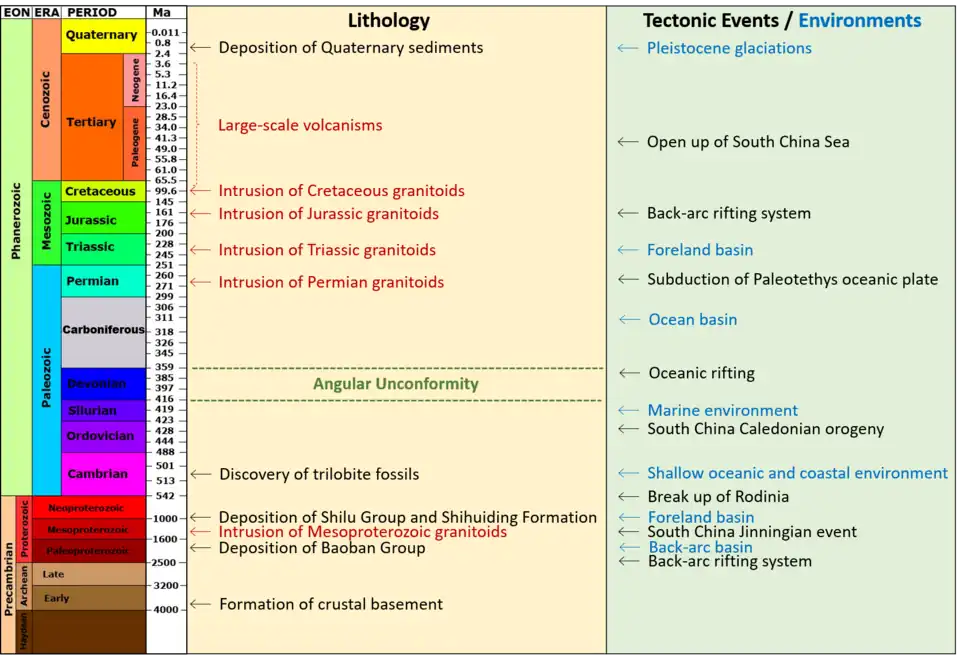 The Cambrian rocks are exposed in the Southern Hainan Island which was composed of fine-grained shale and limestone deposited in shallow oceanic and coastal environment.[10]