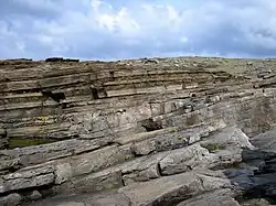 Most of the Old Red Sandstone of Orkney is Middle Devonian.[2] The lower part of the sequence, mostly Eifelian in age, is dominated by lacustrine beds of the lower and upper Stromness Flagstones that were deposited in Lake Orcadie. The two flagstones sequences are divided by the Sandwick fish bed, equivalent to the Achanarras formation of Caithness, representing an unusually persistent, deep and widespread lake that filled much of the Orcadian Basin. The sequence continues with the Rousay flagstones deposited in a similar lacustrine environment. The flagstones show a marked cyclicity in their sedimentation, with 86 such cycles being counted for the whole sequence.[4] These are interpreted as representing regular climatically driven changes in lake level caused by Milankovitch cyclicity.