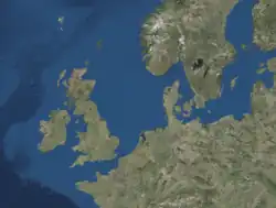 During the Paleozoic there were three major landmasses that collided, Laurentia, Baltica, and Avalonia closing the Iapetus ocean.[3] The event created a mountain chain trending North to South in the northern portion and an East to West trend in the South.[3] The reason being that there is a North to South trend in the North is because Laurentia coming from the West and Baltica coming from the east meeting at the center to create a compressional regime. Through time eventually Avalonia coming from the south closing the Iapetus ocean, collided with the two landmasses to create a T-junction giving an East to West trend in the southern portion.[7] This event is the first major event that would lead to the creation of Pangea. The tectonic event comprised the entire Ordovician and into the early Devonian, the Caledonian rocks are the basement of the current North Sea.[3]