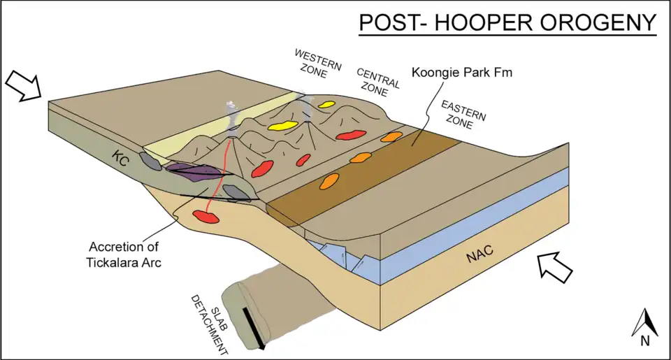After the Hooper Orogeny, the downgoing slab, which had been deeply subducted into the asthenosphere, detached from the surface portion of the tectonic plate. The resulting change in isostasy temporarily buoyed the thinned-out Kimberley Craton section above the North Australian Craton, leading to the formation of the accretionary wedge of the Tickalara Arc, and setting the stage for the later suturing of the Kimberley Craton and North Australian Craton.[2]