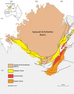 The Lamboo complex is further subdivided into three zones: the Western Zone (contiguous with the Hooper Complex), the Central Zone, and the Eastern Zone, each with different tectonic and stratigraphic characteristics.[2] Formed during the early Paleoproterozoic, the zones formed in different tectonic settings, resulting in their distinct characteristics across zone boundaries.[10] Studies of the region's magnetic anomaly imply that the Western Zone and Central Zone did not collide against each other until the final stages of the Hooper Orogeny, while the Eastern Zone did not collide until the final stages of Halls Creek Orogeny.[9][22][12]
