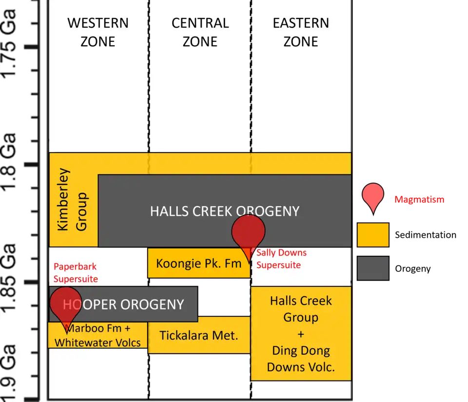 The Eastern Zone contains mafic and felsic volcanic rocks. These were intruded by the granitoid Ding Dong Downs Volcanics, at around 1910 Ma. Both were overlain unconformably by low-grade metamorphic-sedimentary and metamorphic-volcanic rocks, belonging to the Halls Creek Group, which was then metamorphosed during the Halls Creek Orogeny (1835-1805 Ma), and later sutured to the zone by the intrusion of the Sally Downs Supersuite (1820-1810 Ma).[2] The basement of the Halls Creek Group consists of pure quartz sandstone, likely deposited in a fluvial depositional setting, which was later overlain unconformably by mafic, felsic and alkaline volcanic rocks during 1880 Ma and 1857-1848 Ma.[14]