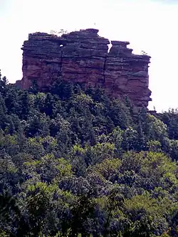 Weathering and erosion over millions of years have created numerous striking rock formations, particularly in the southeastern Palatinate Forest.[31] Depending on the erosion of the Trifels Formation, these include rock towers (e.g., Hundsfelsen near Waldhambach), rock walls (e.g., Asselstein near Annweiler), rock cliffs (e.g., Dimberg near Dimbach), and rock blocks (e.g., Lindelbrunn near Vorderweidenthal). Small-scale weathering of narrow, variably hard layers produced rock openings, gate rocks (e.g., Eichelberg near Busenberg), and table rocks (e.g., Teufelstisch near Hinterweidenthal). The nearly two-kilometer-long Altschlossfelsen features rock fissures, overhangs, and honeycomb weathering, while rock seas and block fields characterize valley and mountain regions in the central Palatinate Forest.