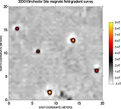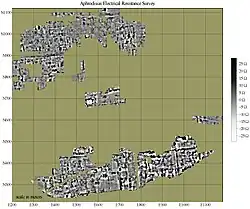 Electromagnetic (EM) conductivity instruments have a response that is comparable to that of resistance meters (conductivity is the inverse of resistance). Underground archaeological features are detected by creating a magnetic field underground by applying an electric current that has a known frequency and magnitude through a sending coil. The currents spur a secondary current in underground conductors that is picked up by a receiving coil. Changes in the underground conductivity can indicate buried features.[2][3] Although EM conductivity instruments are generally less sensitive than resistance meters to the same phenomena, they do have a number of unique properties. One advantage is that they do not require direct contact with the ground, and can be used in conditions unfavorable to resistance meters. Another advantage is relatively greater speed than resistance instruments. Unlike resistance instruments, conductivity meters respond strongly to metal. This can be a disadvantage when the metal is extraneous to the archaeological record, but can be useful when the metal is of archaeological interest. Some EM conductivity instruments are also capable of measuring magnetic susceptibility, a property that is becoming increasingly important in archaeological studies.