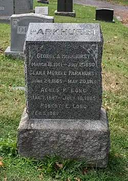 Parkhurst died on July 2, 1890, at the age of forty-nine, after suffering a stroke at his New York residence.[1] He was survived by his second wife Clara (née Morell; 1865–1913). Katherine "Kate" Parkhurst (1845–1881), his first wife, was the mother of his three children of which two, Benjamin and Bianca, survived to adulthood.[1][8] Parkhurst was interred at Prospect Hill Cemetery, Washington, D.C.[9]