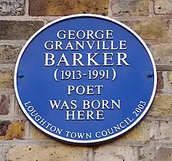 George Barker was born on 26 February 1913 in Loughton, Essex, a stone's throw from Epping Forest. His father, George Barker (1879–1965), who had worn many hats from a temporary police constable to a butler at Gray's Inn,[1][2] brought to the family a history of military service, having risen to the rank of Major during World War I. Marion Frances (1881–1953), née Taaffe, his mother, hailed from Mornington, County Meath. It was in Chelsea, London, at the age of six months,[3][4][5][6] that Barker began his urban odyssey.