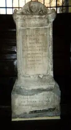 At one point Chapman appears to have returned to Hertfordshire to evade his creditors, but he died in London. He was buried at St Giles in the Fields. A monument to him designed by Inigo Jones marked his tomb, and stands today inside the church.[4] Jones was a friend of Chapman and had collaborated with him on projects such as The Memorable Masque of the Middle Temple and Lincoln's Inn.